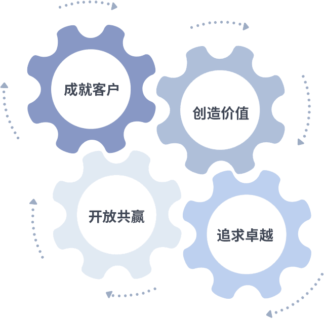 成就客户是一切决策的出发点,,创造价值是衡量所有工作的标准,,,追求卓越是我们做事做人的态度,,,,开放共赢是我们的格局也是最终的结果。。价值观的齿轮环环相扣,,,,推动着组织里的每个人不断向前。。